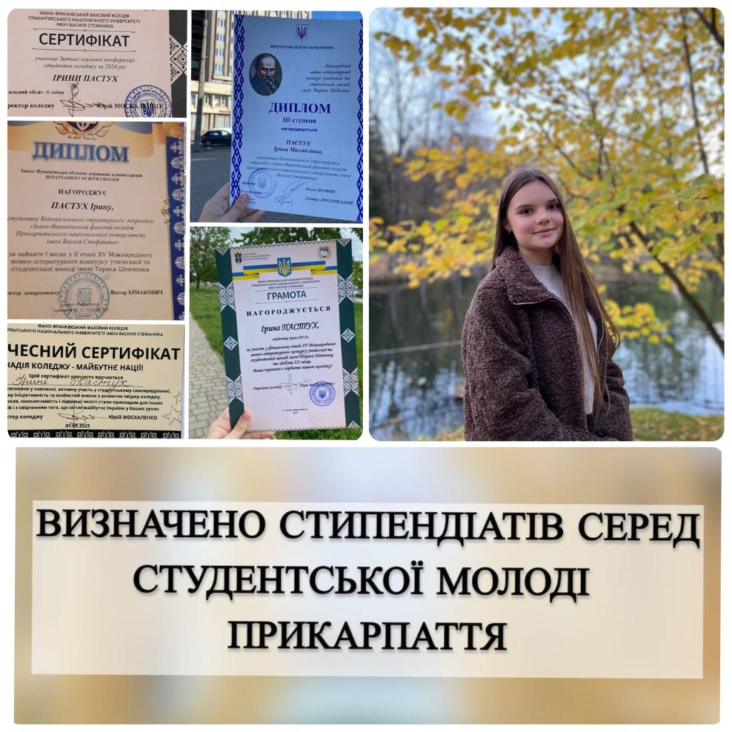 У 2025/2026 н. р. 131 студент Прикарпаття отримуватиме стипендію з обласного бюджету за високі результати у навчанні, науці, творчості та громадській діяльності. Серед десяти кращих представників закладів фахової передвищої освіти області — наша Ірина ПАСТУХ!